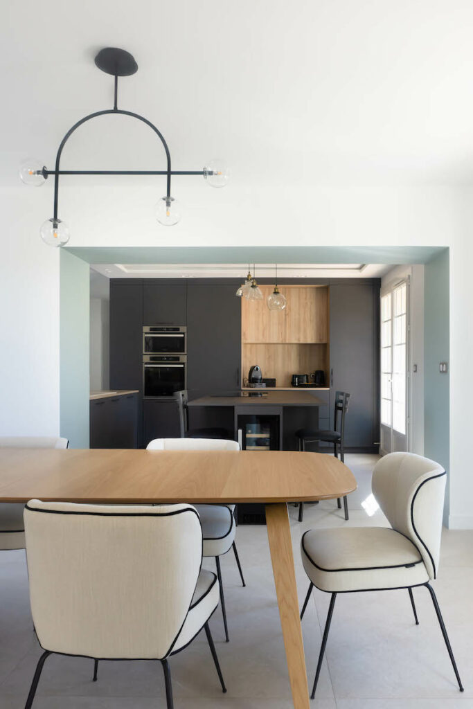 SALLE A MANGER AVEC CHAISES NOIRES ET PLAFOND BEIGE